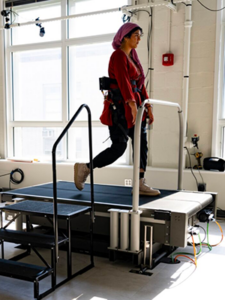Tourk testing the hip mobility aid. Photo Credits: Victoria Manjarrez, Alyssa Stone/Northeastern University