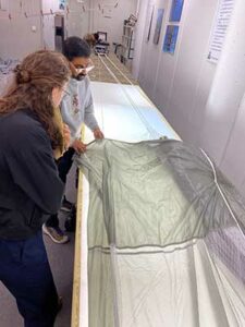 The Capstone team examining and measuring a parachute with PADS team members.