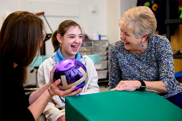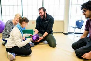 She is working with Sanchez, and LABBB therapists Jo-Ellen Percival and Cheryl Rogers on developing gross motor skills using a ball such as passing, sharing and rolling.