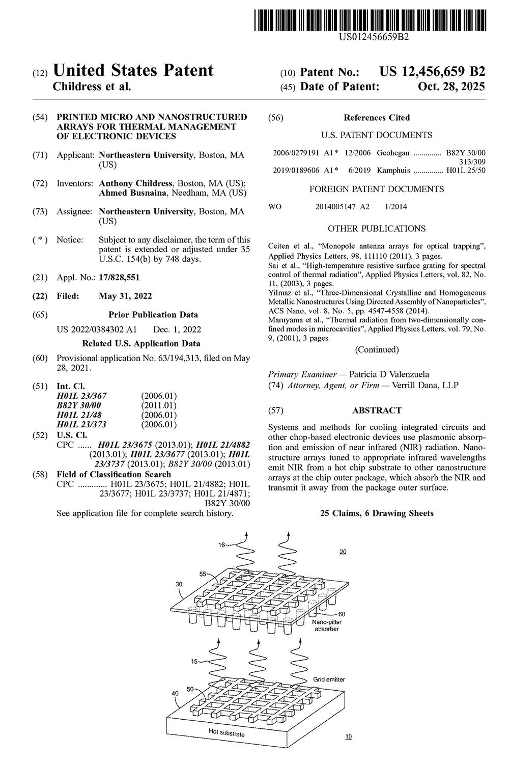 University Distinguished and MIE William Lincoln Smith Professor Ahmed Busnaina was awarded a patent for “Printed micro and nanostructured arrays for thermal management of electronic devices.”