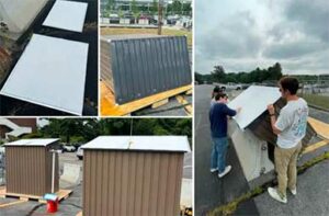 Rooftop cooling paint reduced the interior temperature of temporary storage sheds in Texas and Northeastern’s Burlington campus this summer by at least 5 degrees Celsius. Courtesy photos